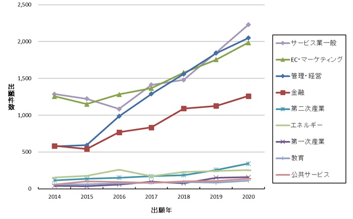 ビジネス関連発明は、2000年に生じた出願ブームで急激に増加したあとは、減少傾向でしたが、2012年頃から増加に転じています。また、分野別でみると、サービス業一般(宿泊業、飲食業、不動産業、運輸業、通信業等)、EC・マーケティング(電子商取引、オークション、マーケット予測、オンライン広告等)、管理・経営(社内業務システム、生産管理、在庫管理、プロジェクト管理、人員配置等)、次いで金融が上位を占めており、また、大きく伸びています。※2