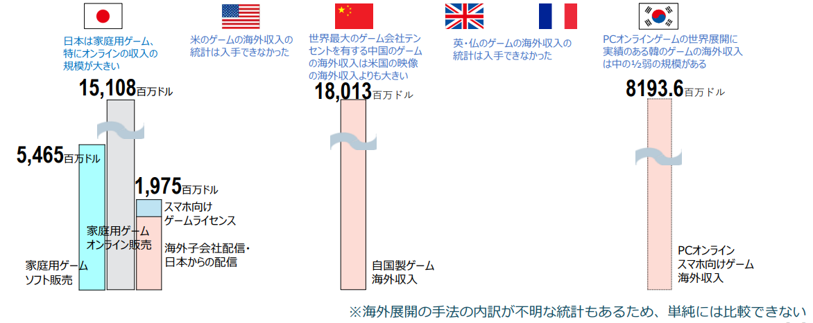 しかしながら、過去10年間の我が国の市場成長率は僅か2.3%で、米国6.1%、韓国6.0%、英国5.8%、中国23.0%、インド10.8%等と比較して伸び悩んでいます。(数値は広告を含む。)※3,※5 さらには、2020年から2025年までの5年間における各国のエンタテイメント・メディア業界の収益予測において、日本の成長率は、53か国中で最下位となるとの予測もあります。※4,※5 日本は家庭用ゲームで世界トップを維持する一方、成長市場であるスマートフォン向けゲームの海外収入は、中国、韓国に大きく差をあけられています。※5(図2)
